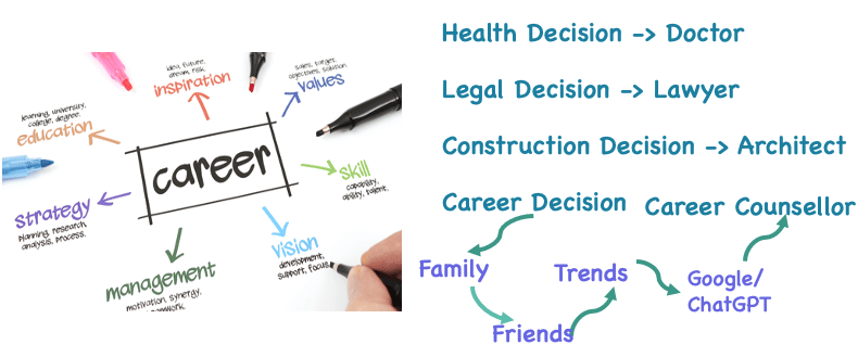 Approaching a doctor for your health concerns, a lawyer for legal matters or an architect for your construction needs is obvious, isn't it ? But when it comes to one of the biggest decisions of life — your career — many students and professionals still rely on family opinions, social media trends, Google searches or more recently, ChatGPT clues.